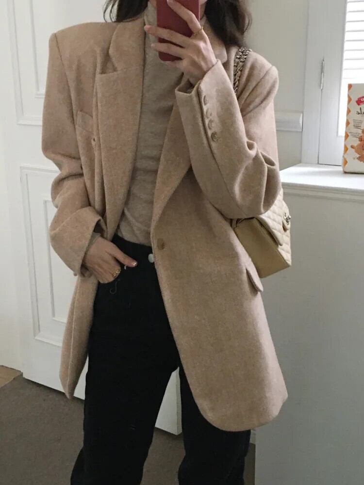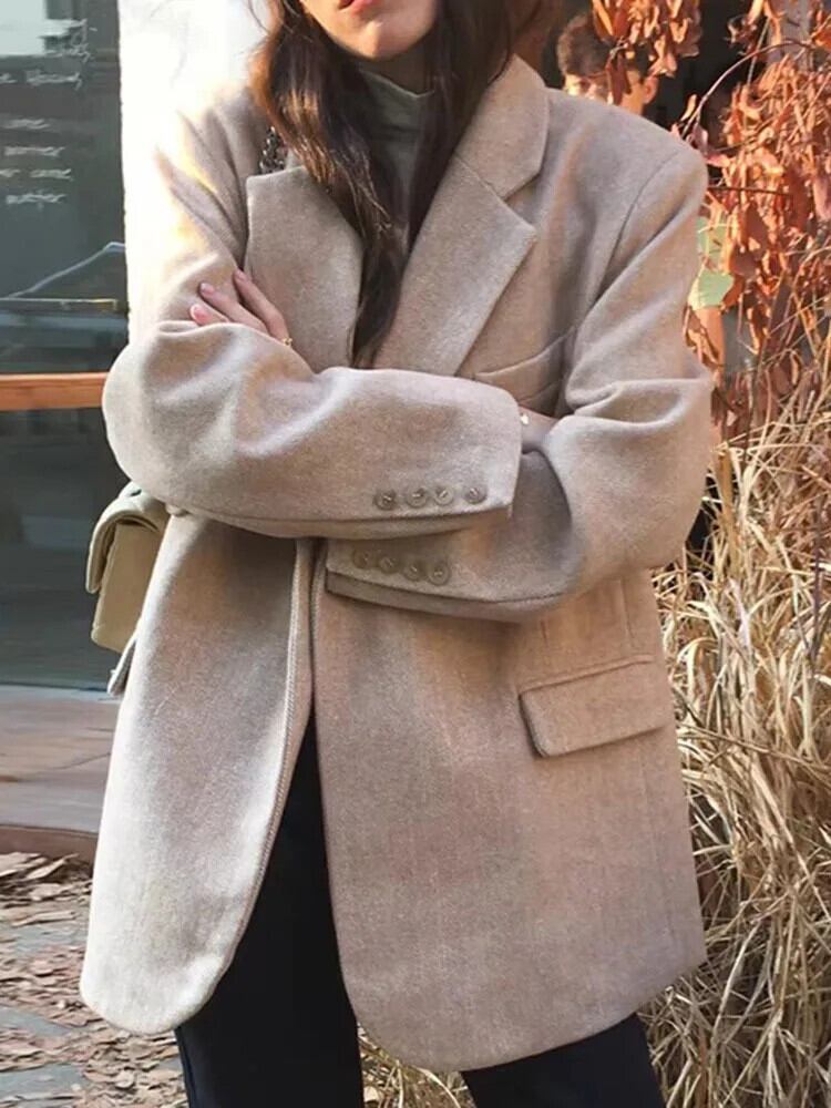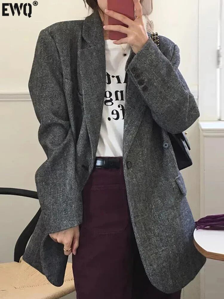 [EWQ] スーツ襟シングルブレストポケット長袖ヘリンボーンカーディガンジャケットアウターコート秋冬 16U5839 ロング オータム 秋物 ウィンター 冬物