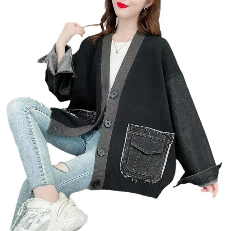 [EWQ] 長袖 ビッグサイズ シングルブレスト ダークグレー デニム ステッチ ニット カーディガン ジャケット 冬 秋 ロング オータム 秋物 ウィンター 冬物