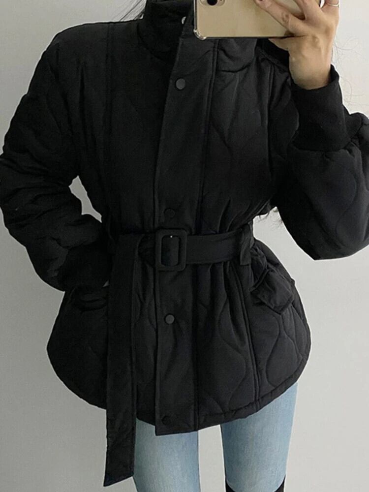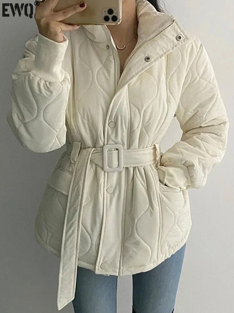 [EWQ] 暖かい スタンドネック ジッパー ボタン コート ウェーブ エンボス レースアップ レディース オールマッチ 中綿ジャケット 秋冬 6U6962 コットン オータム 秋物 ウィンター 冬物