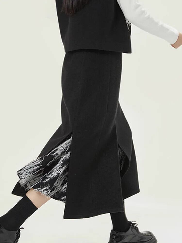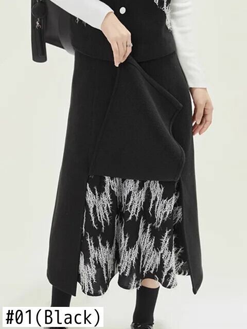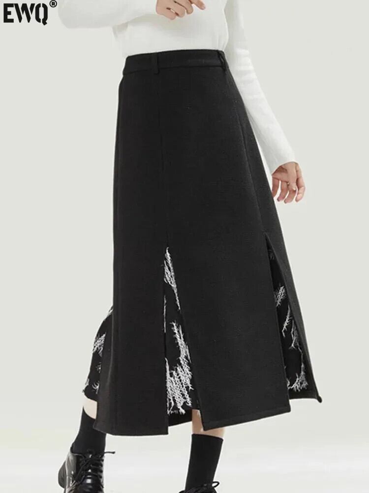 [EWQ] ストリート ブラック ウエストロスデ スプリットスカート レディース ミドル丈 オールマッチ Aラインスカート 2024秋冬 16U7383 オータム 秋物 ウィンター 冬物