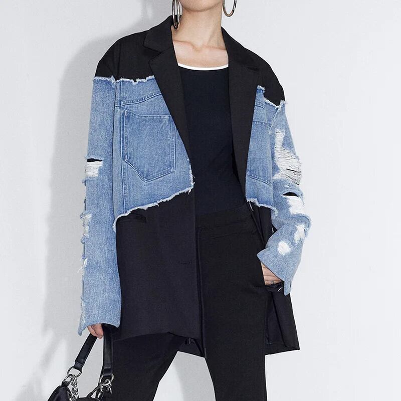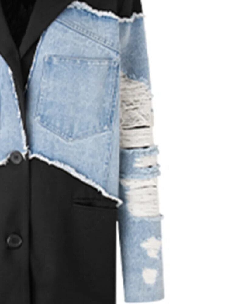 [EWQ] デニムパッチワークブレザーノッチ襟穴長袖シングルブレストスーツジャケット冬 LM0107 ロング ウィンター 冬物