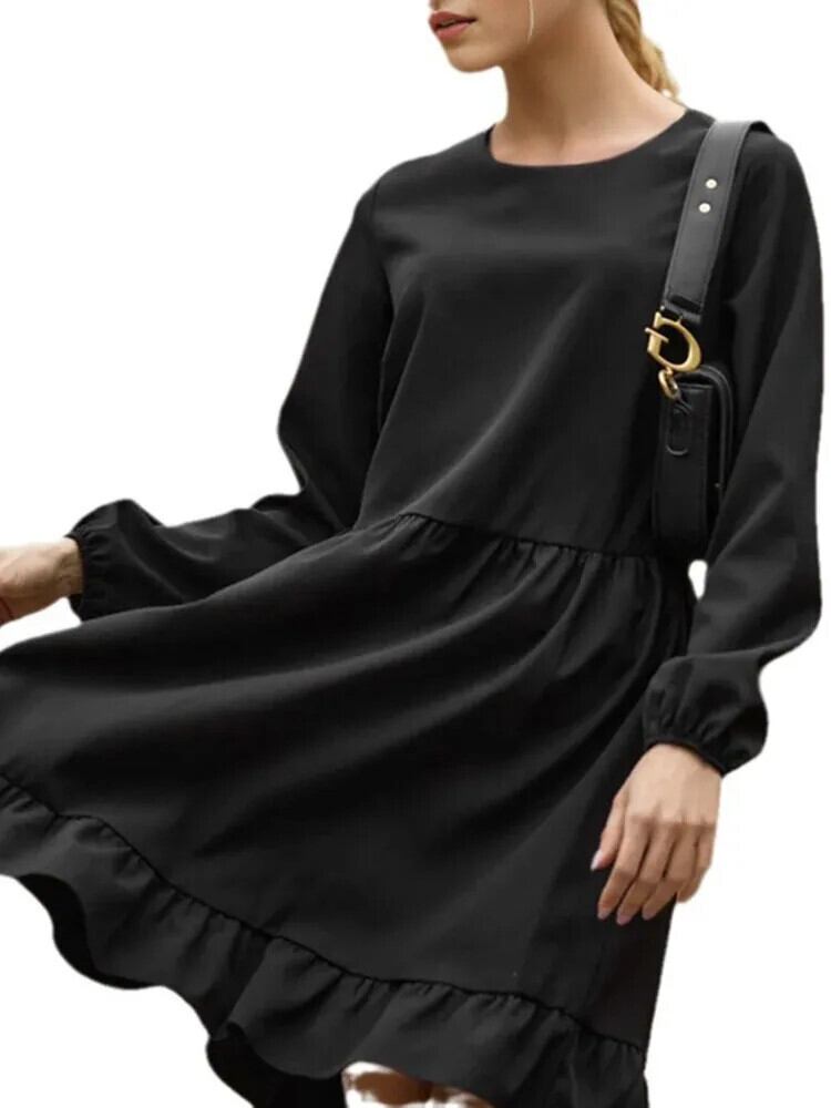 [EWQ] ルーズブラックフリルエッジドレスレディースミニマリストラウンドネックバブルスリーブ A ラインショートドレス 2024 春秋 16U7372 スプリング 春物 オータム 秋物 Oネック Aライン