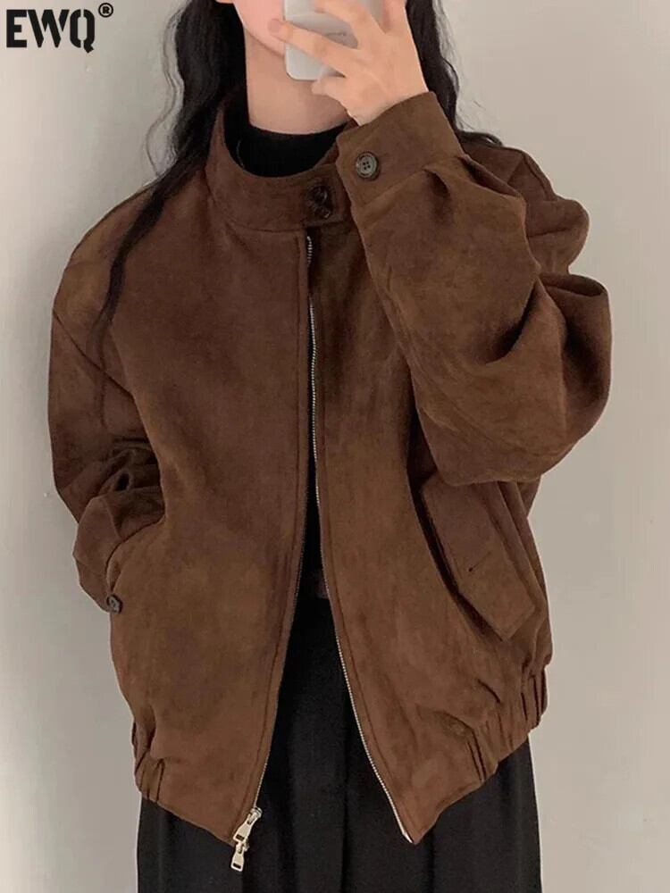 [EWQ] レディース コート シック ハンサム 立ちネック ダブルジッパー ルーズ 長袖 ショート ジャケット 2024年秋 23A4849 ロング オータム 秋物