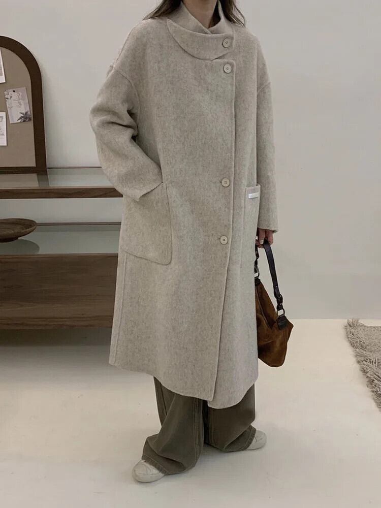 [EWQ] スタンドカラー シングルブレスト 両面ウールコート ビッグポケット ロング ウール レディース アウター トップス 秋冬 6U6674 オータム 秋物 ウィンター 冬物
