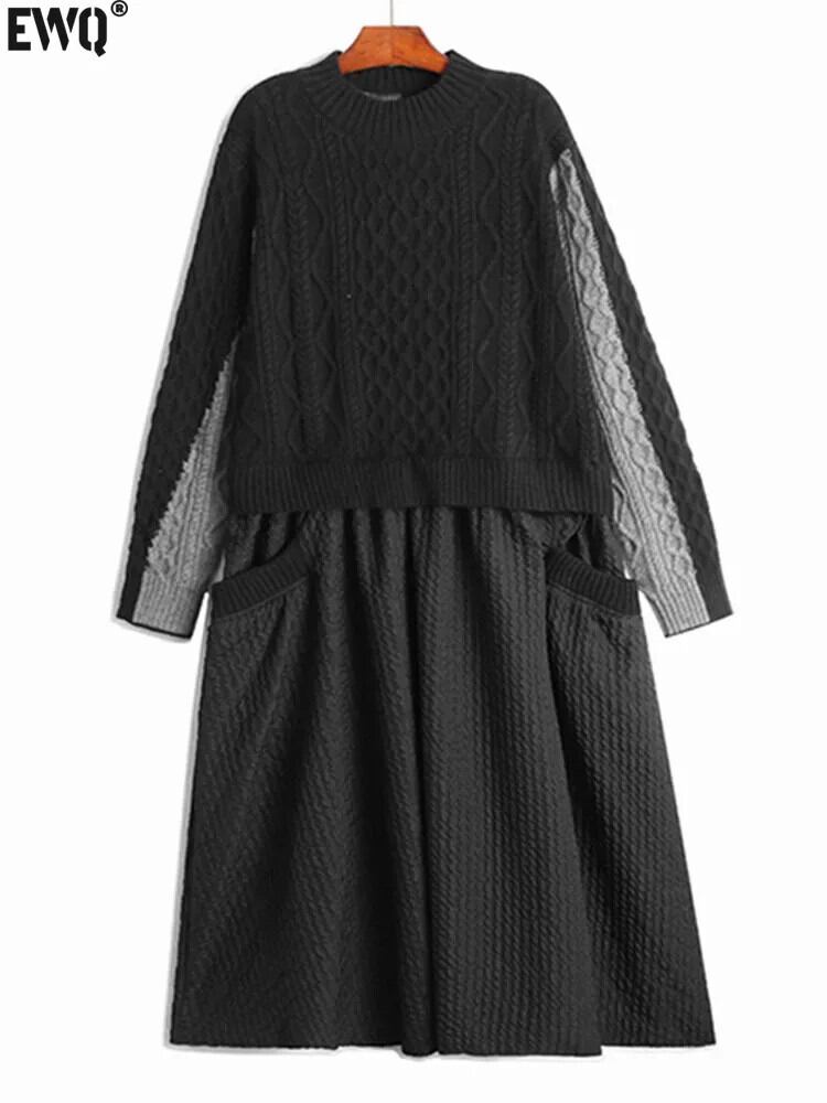 [EWQ] ユニークニットパネルポケットドレスルーズ長袖プルオーバーマキシドレス 2024 春夏 16U7192 ロング スプリング 春物 ウィンター 冬物