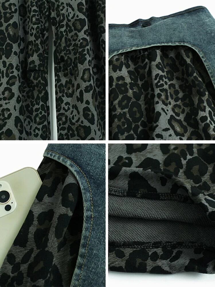 [EWQ] ヨーロピアンスタイル Y2K クロスネクタイ デニム パッチワーク ヒョウ柄 ルーズ ワイドレッグ パンツ レディース 2024 春秋 16U7026 スプリング 春物 オータム 秋物 ワイドパンツ