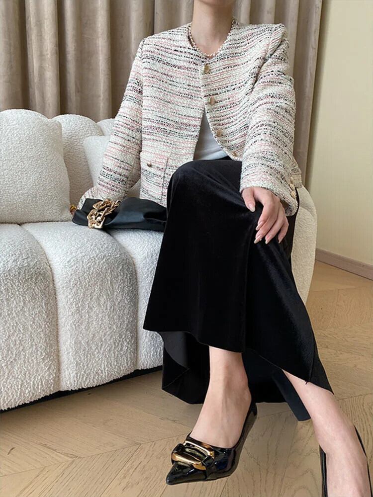 [EWQ] 気質不規則ストライプコントラストカラーツイードジャケット O ネックウールコートトップス秋 23A4515 オータム 秋物 Oネック