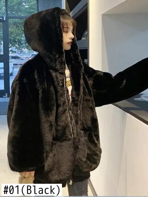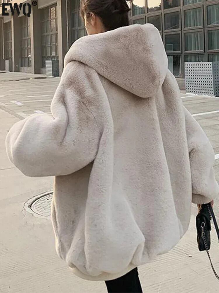 [EWQ] ゆったりぬいぐるみフェイクファーフード付きジャケットレディース厚く暖かいポケットアウターコート 2024 春冬 16U6966 スプリング 春物 ウィンター 冬物