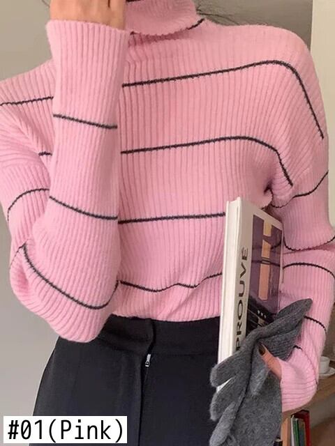 [EWQ] コントラストストライプ厚く暖かいターンリネック長袖ニットピンクセータートップ 2024 春夏 16U7322 ロング スプリング 春物 ウィンター 冬物