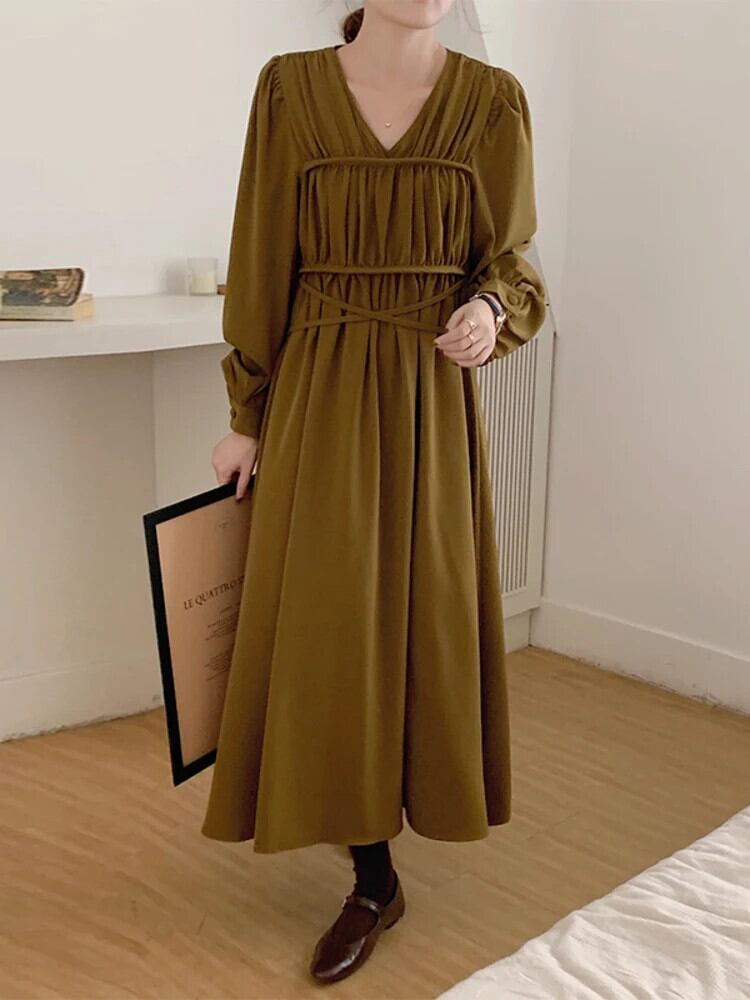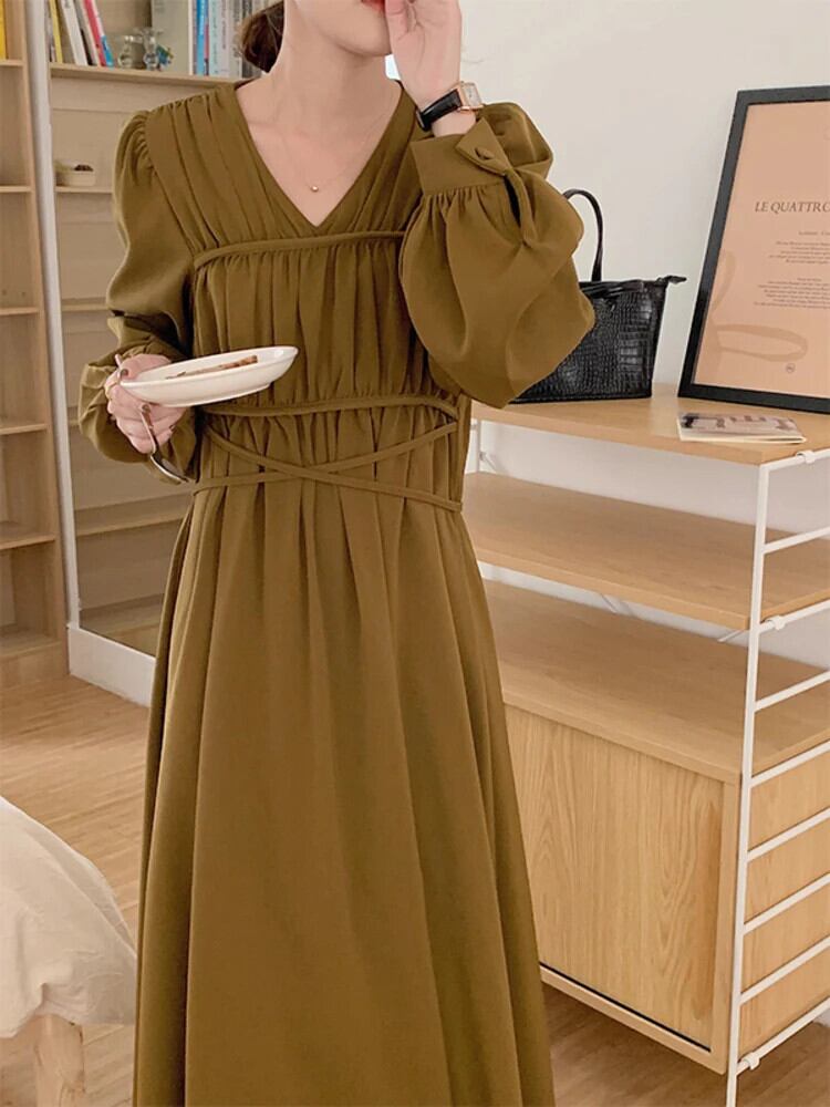 [EWQ] V ネックプリーツパッチワークドレス長袖黒ドレス Vestido 秋冬 16U4372 ロング ブラック オータム 秋物 ウィンター 冬物 Vネック