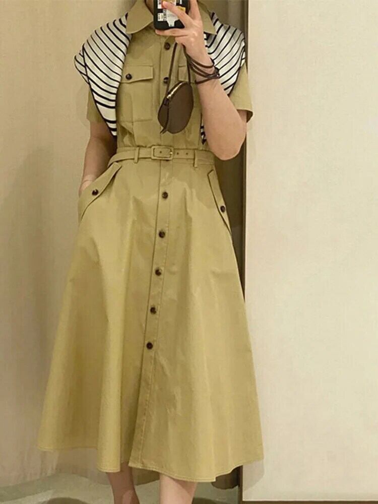 [EWQ] サファリスタイルレースアップシングルブレスト半袖ドレスロングドレス 2024 春秋 U7545 ショート ハーフスリーブ スプリング 春物 オータム 秋物