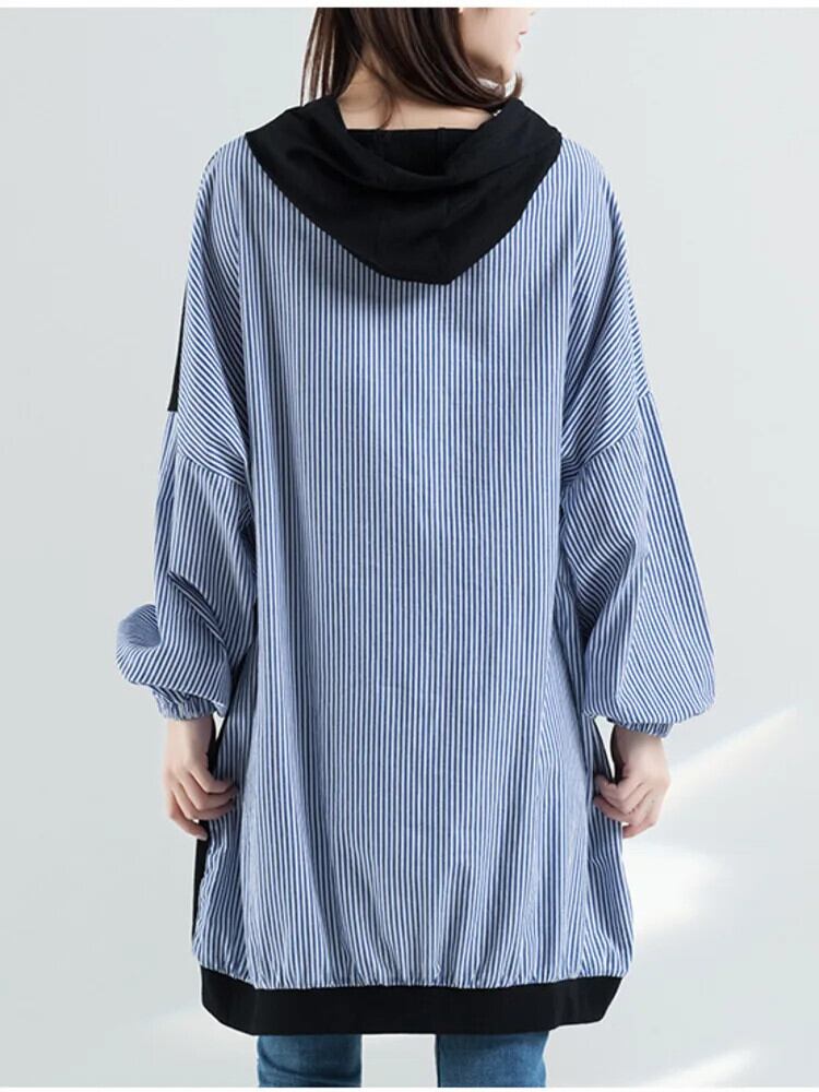 [EWQ] 大きいサイズ レディース ストライプ パッチワーク ルーズ トレーナー 巾着 フード付き トップス レディース 2024 春秋 16U7393 スプリング 春物 オータム 秋物