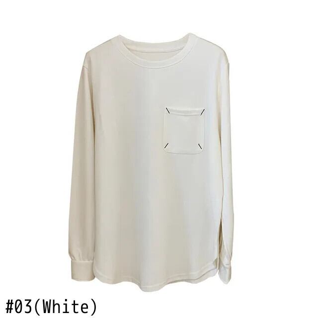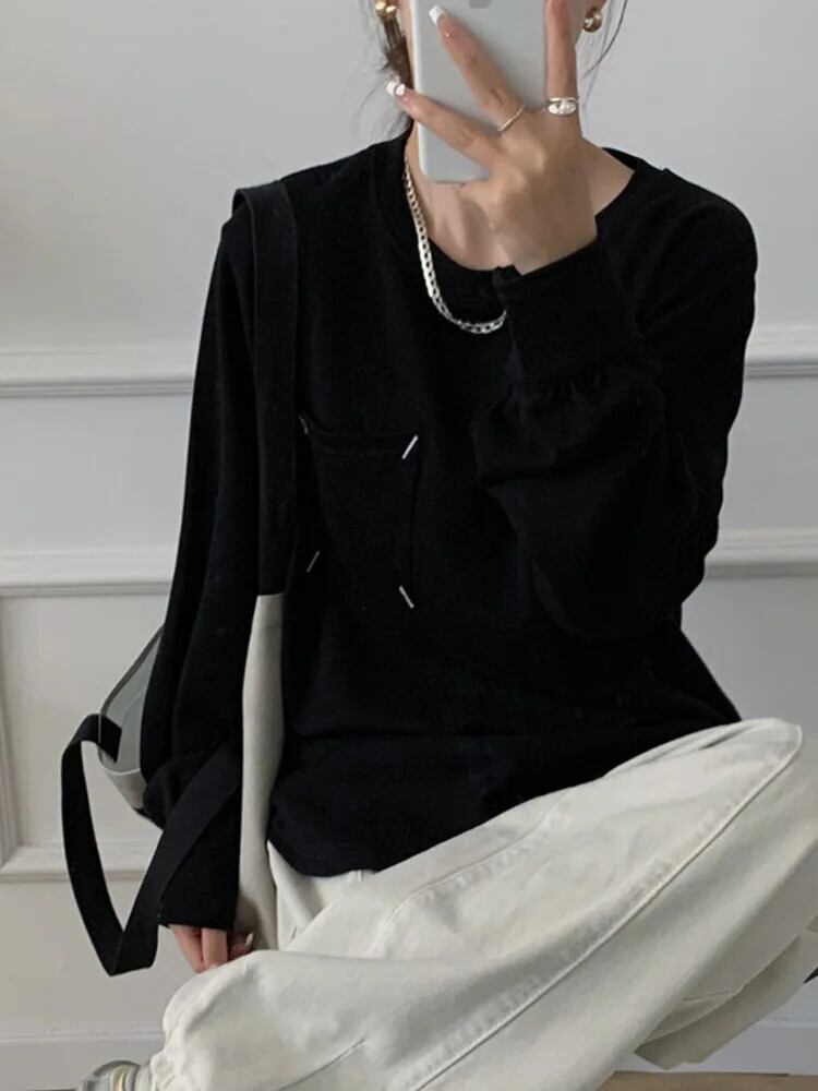 [EWQ] スタイルソリッドカラーポケット刺繍長袖 Tシャツルーズオールマッチトップ 2024 春秋 U7734 ロング レッド スプリング 春物 オータム 秋物