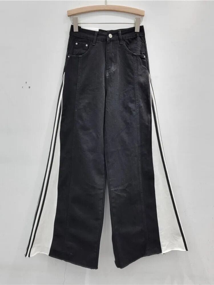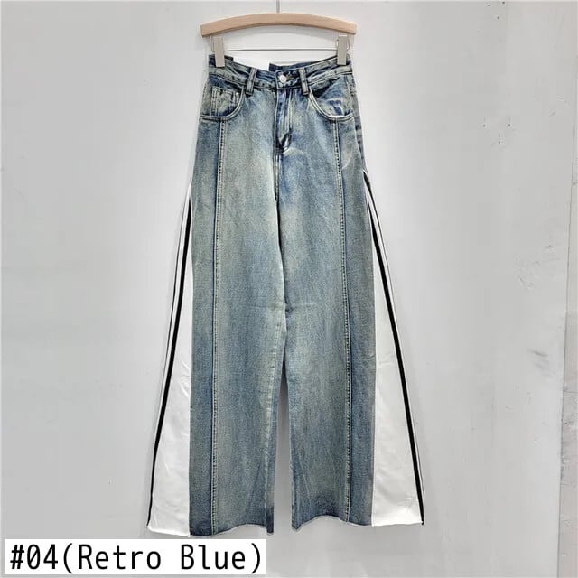 [EWQ] コントラストカラーパッチワークウエストジーンズ Y2K ルーズストレートレッグワイドレッグパンツ 2024 春秋 7608 スプリング 春物 オータム 秋物 ワイドパンツ