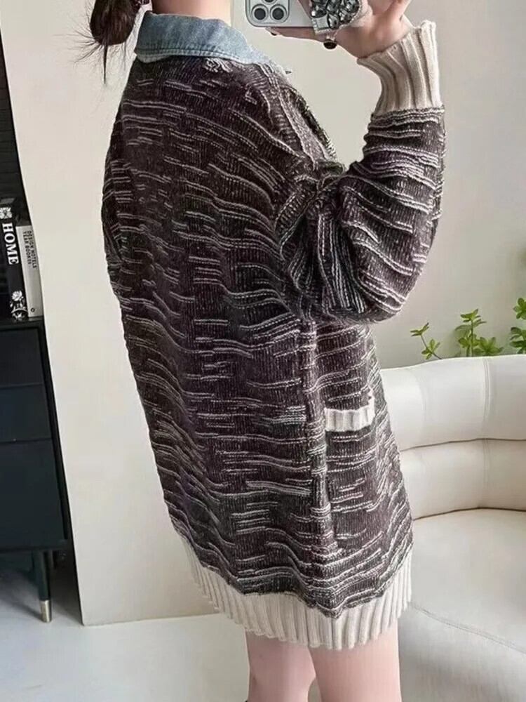 [EWQ] ラペル シングルブレスト デニム パッチワーク レディース オールマッチ ニット カーディガン セーター 2024 春秋 16U6954 スプリング 春物 オータム 秋物