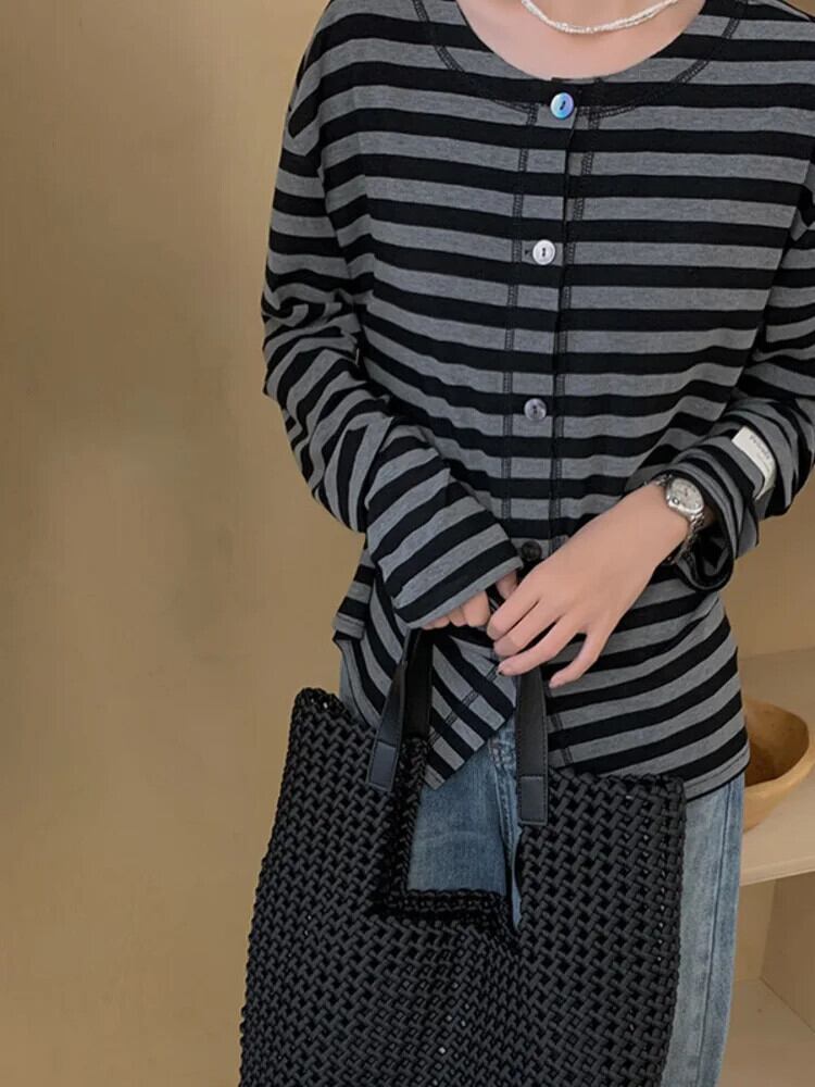 [EWQ] パーソナライズストライプシングルブレスト長袖 Tシャツオールマッチ O ネックトップ 2024 春秋 7733 ロング スプリング 春物 オータム 秋物 Oネック