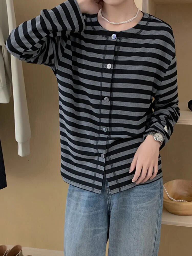 [EWQ] パーソナライズストライプシングルブレスト長袖 Tシャツオールマッチ O ネックトップ 2024 春秋 7733 ロング スプリング 春物 オータム 秋物 Oネック