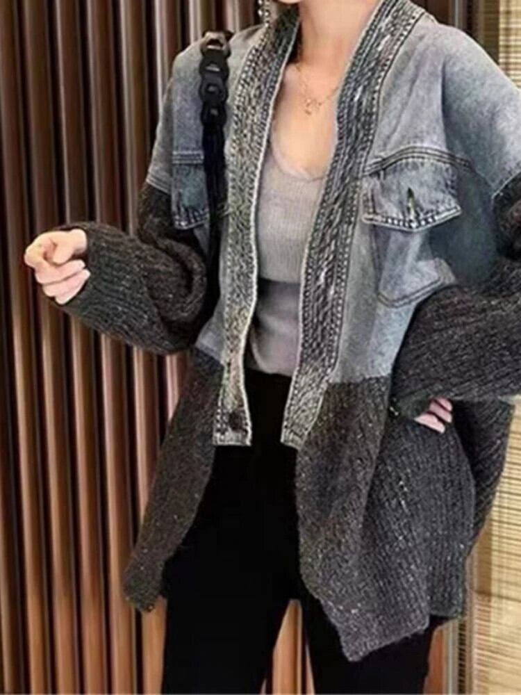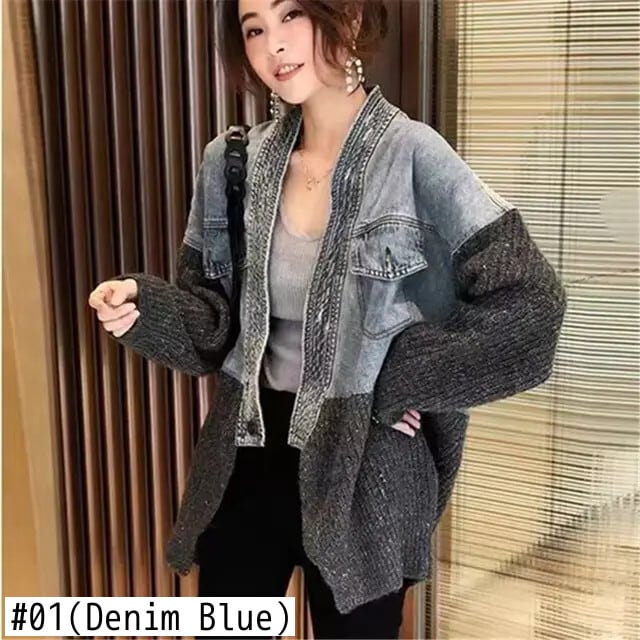 [EWQ] ヨーロピアンスタイル デニム パッチワーク カーディガン ニット ジャケット ゆったり Vネック 長袖 トップス 2024 春 秋 16U7139 ロング スプリング 春物 オータム 秋物