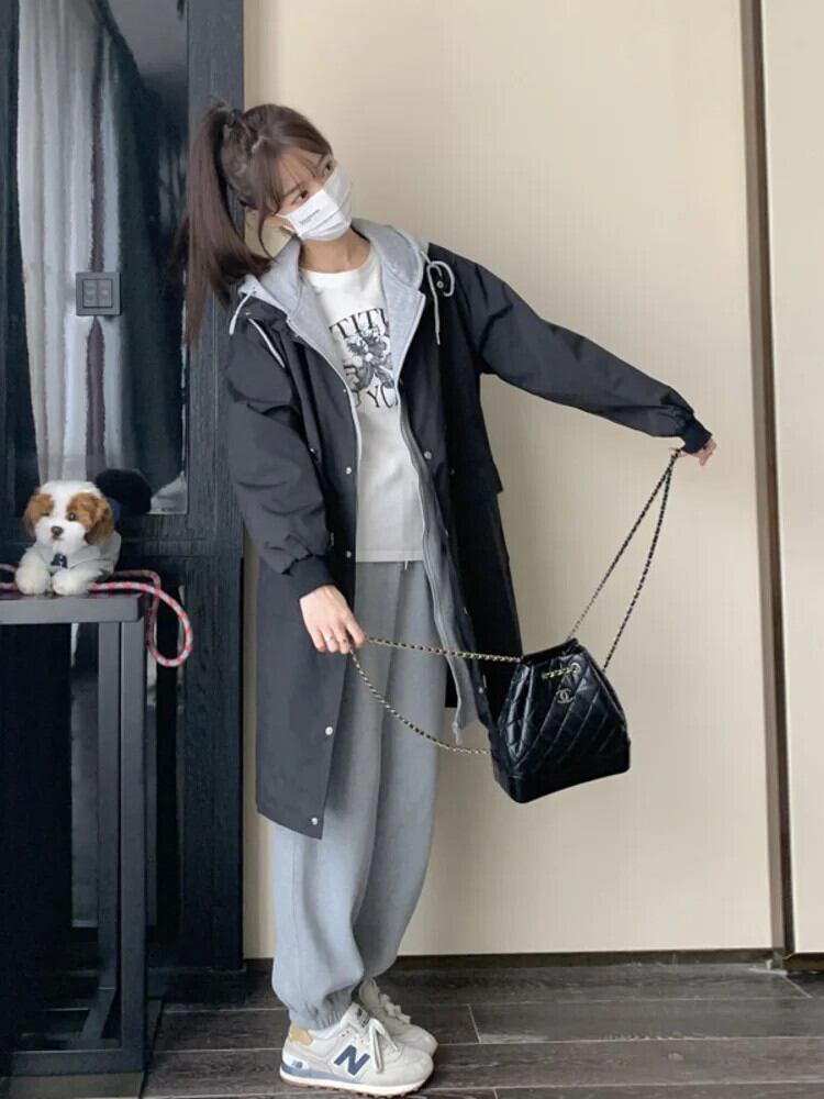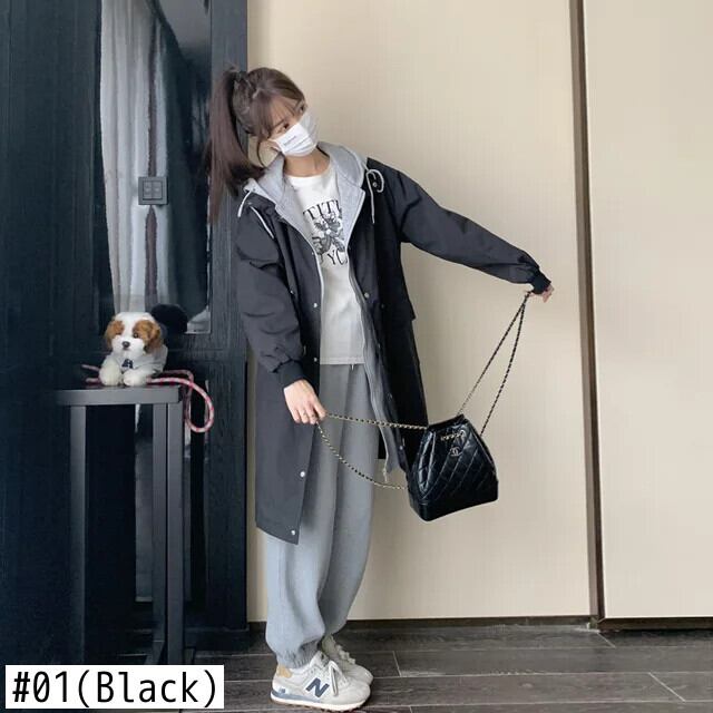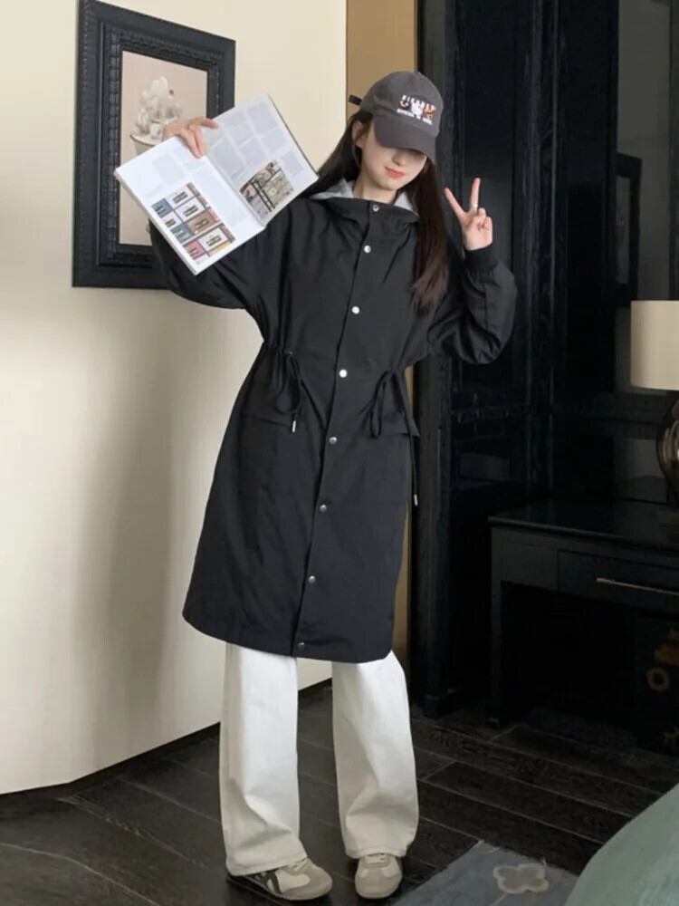 [EWQ] スタイルフェイクツーピースブラックフード付きトレンチジャケットルーズオールマッチコート 2024 春秋 6U7679 スプリング 春物 オータム 秋物