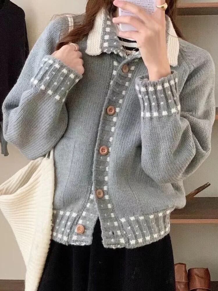 [EWQ] スタイルカラーブロッキングポロネックルーズニットカーディガンシンプルオールマッチセーターレディース 2024 春秋 16U7684 スプリング 春物 オータム 秋物
