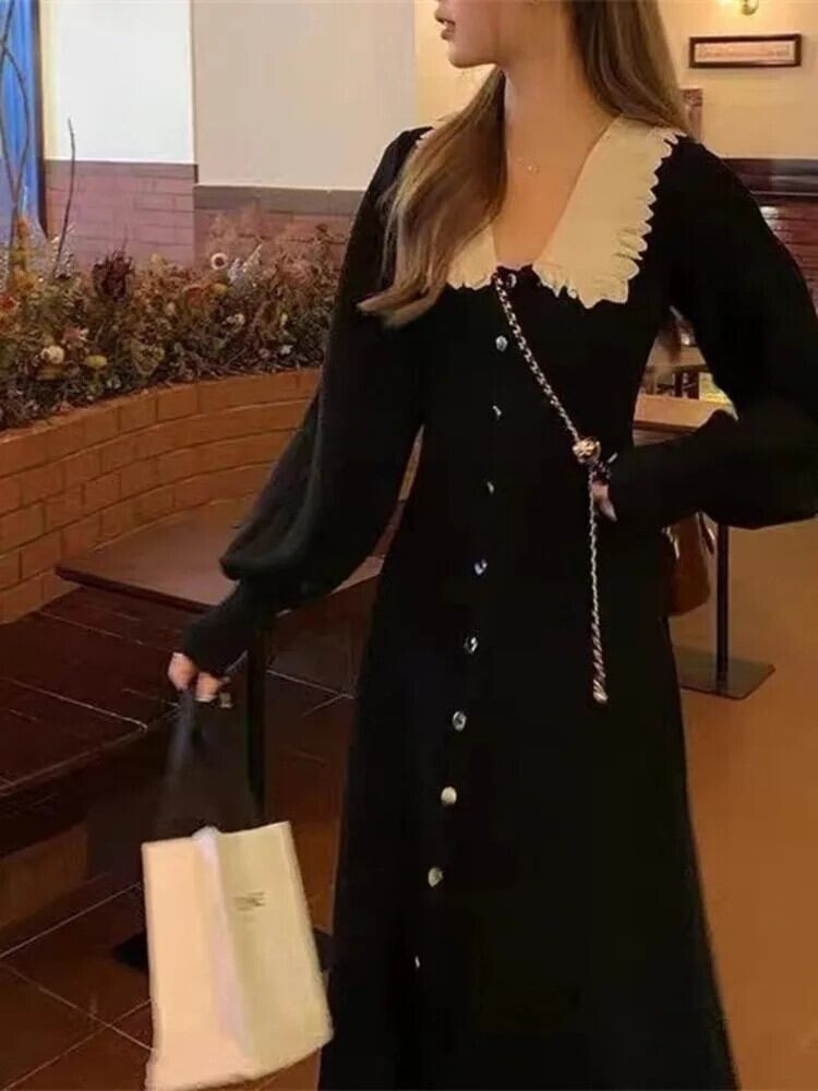 [EWQ] ミニマリスト ニット パッチワーク シングルブレスト ワンピース レディース 長袖 ウール ワンピース 2024 春秋 6U7628 ロング スプリング 春物 オータム 秋物