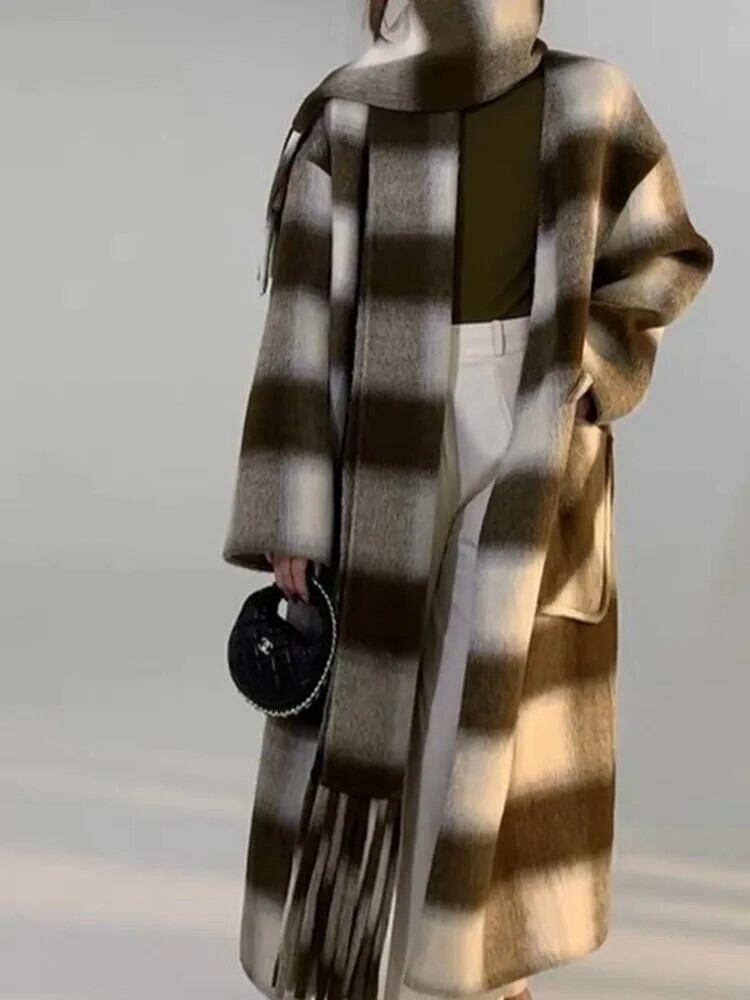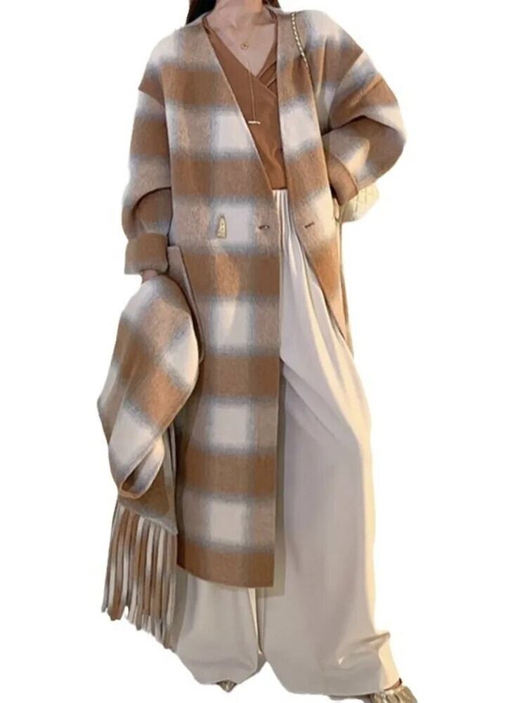 [EWQ] 取り外し可能スカーフ V ネック ボタン 両面カシミヤ チェック柄 アウター ウール コート 2024 春夏 16U7066 スプリング 春物 ウィンター 冬物 Vネック