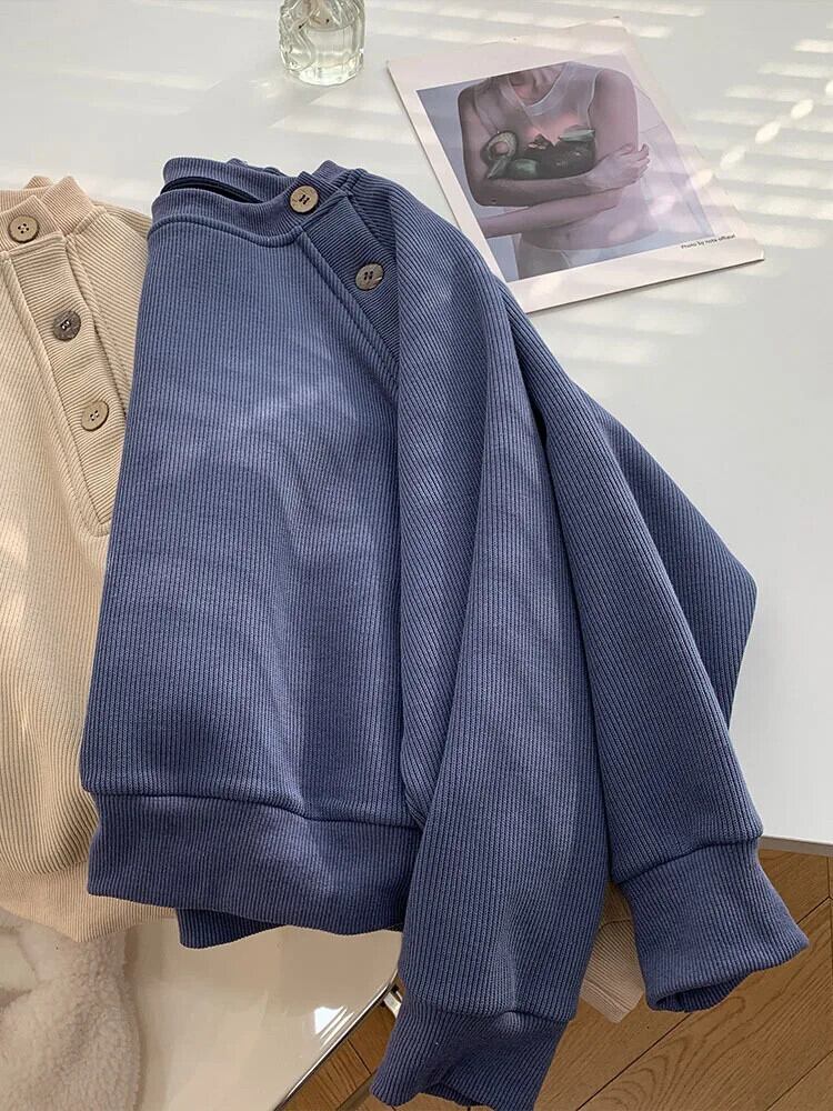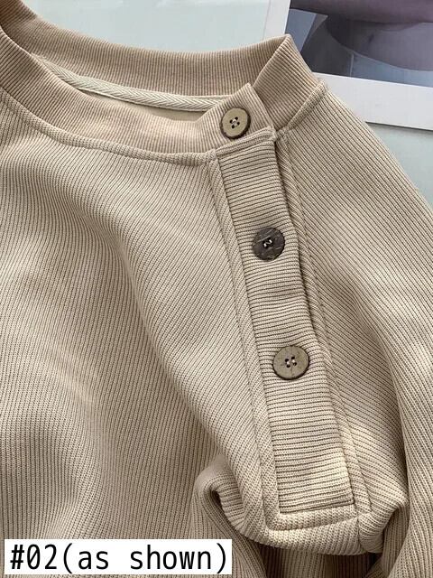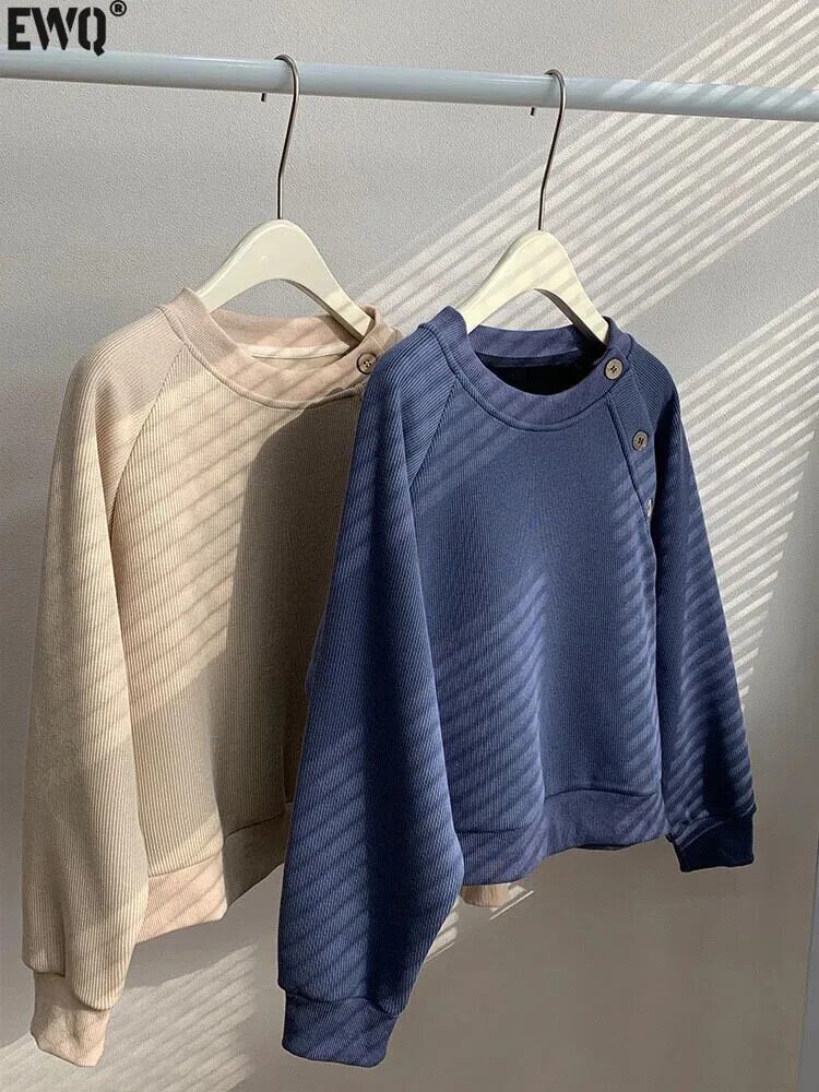 [EWQ] O ネック長袖プルオーバースウェットシャツ木製バックルぬいぐるみ厚手ソリッドカラーニットテクスチャーパーカー 2024 春秋 7361 ロング スプリング 春物 オータム 秋物 Oネック