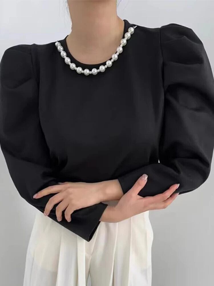 [EWQ] シック O ネック パール プルオーバー シャツ ルーズ オールマッチ バブル スリーブ トップス レディース 2024 春秋 16U7643 スプリング 春物 オータム 秋物 Oネック 真珠