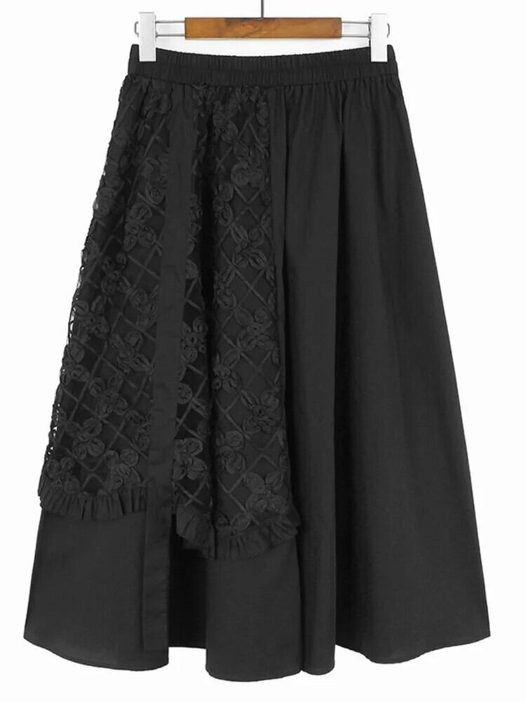 [EWQ] フラワーメッシュパッチワーク弾性ハーフスカートルーズオールマッチミドル丈 A ラインスカート 2024 春秋 U7211 エラスティック 伸縮 スプリング 春物 オータム 秋物 Aライン フラワーデザイン