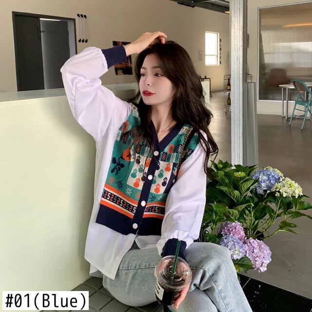 [EWQ] スタイルシングルブレスト V ネック薄手フェイクツーピースシャツプリント長袖トップ 2024 春秋 U7218 ロング スプリング 春物 オータム 秋物 Vネック