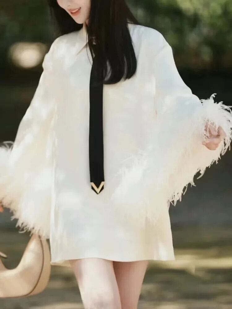 [EWQ] フェザートランペット袖白シャツドレスルーズスイートショートパーティードレス 2024 春秋 U7261 ホワイト 大人ガーリー スウィート キュート カジュアル スプリング 春物 オータム 秋物