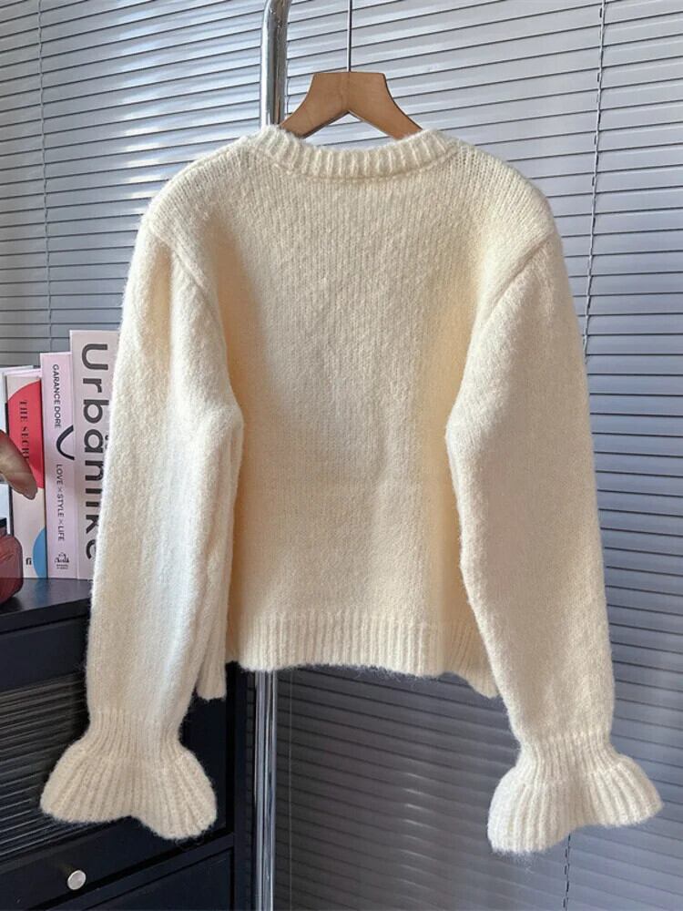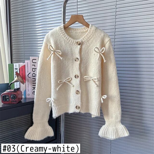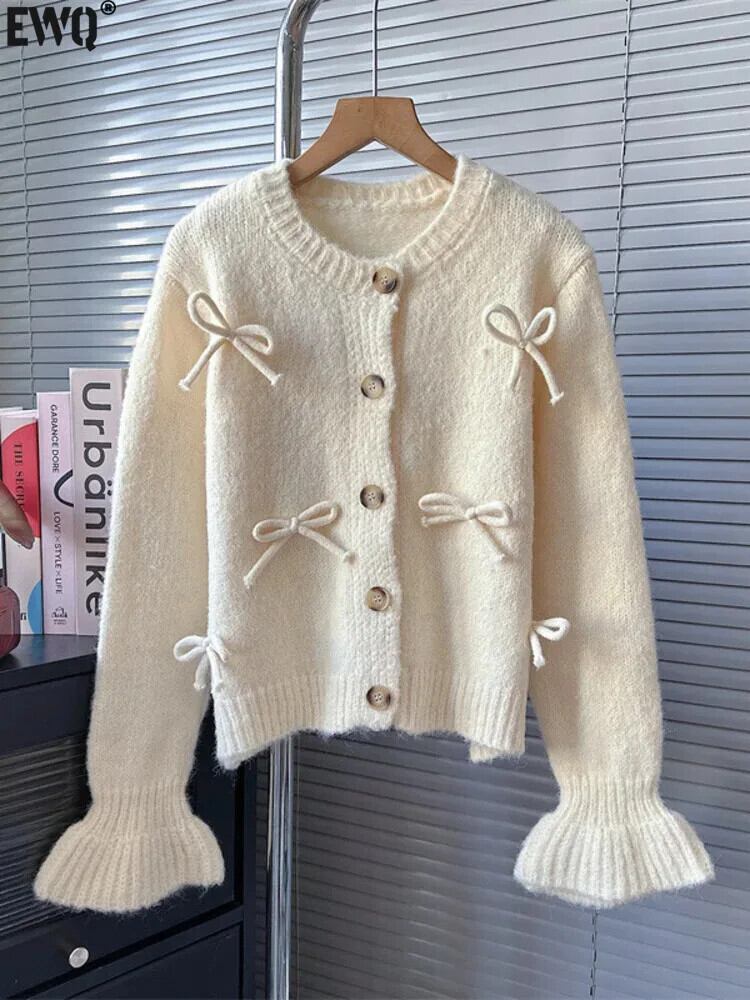 [EWQ] 弓シングルブレストセータートランペット袖ニットカーディガンニットジャケット 2024 春冬 23A6606 リボン スプリング 春物 ウィンター 冬物