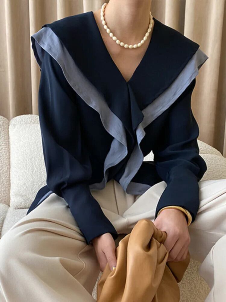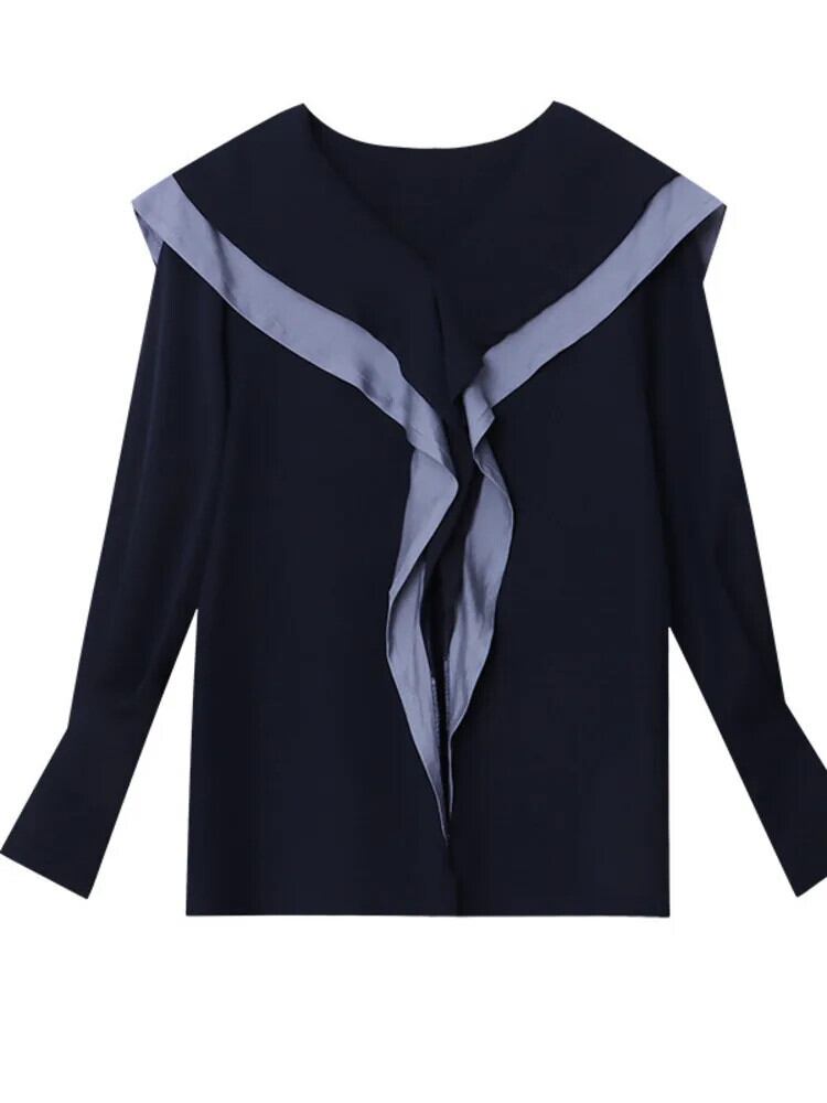 [EWQ] スタイルセーラーカラーシャツカラーブロックオールマッチプルオーバー薄手ブラウスレディース 2024 春夏 059 スプリング 春物 サマー 夏物