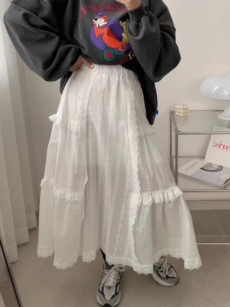 [EWQ] スタイルオールマッチアウトレース弾性スカートフックフラワー A ラインスカート 2024 春夏 034 エラスティック 伸縮 スプリング 春物 サマー 夏物 Aライン フラワーデザイン