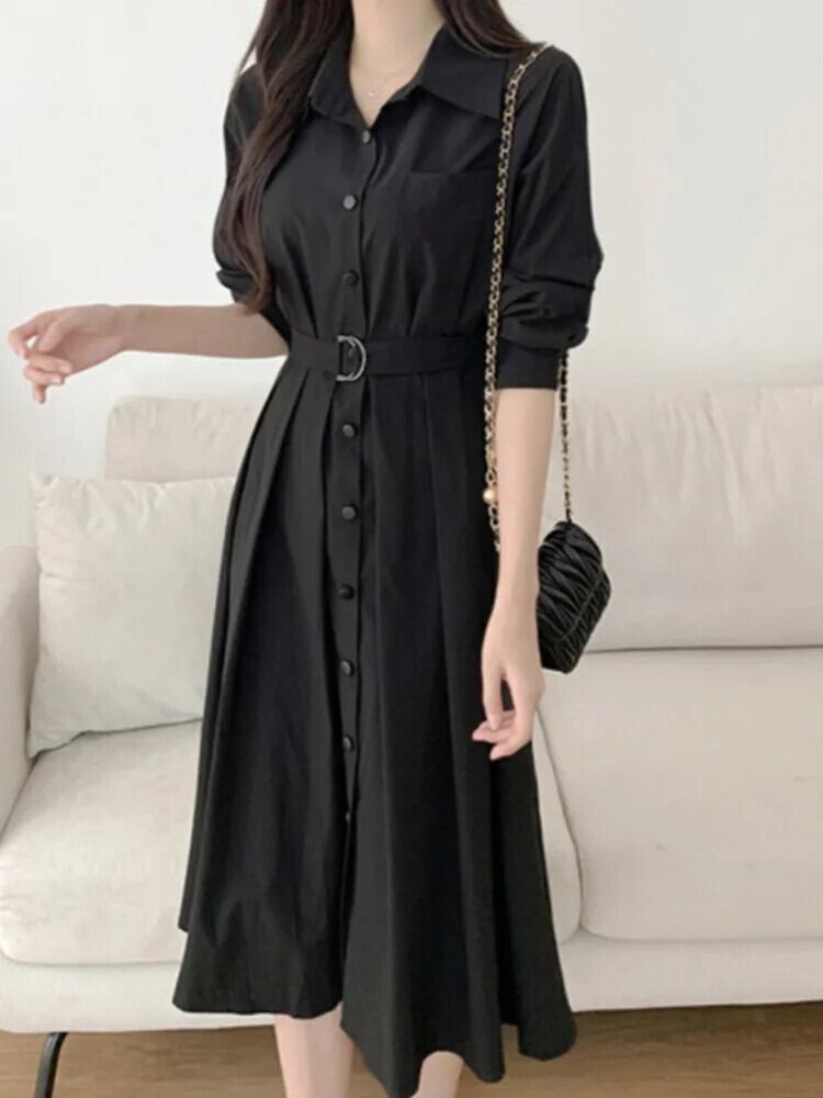 [EWQ] スタイル襟プリーツレースアップウエスト締めドレスカーディガンミドル丈ドレス 2024 春夏 7971 スプリング 春物 サマー 夏物