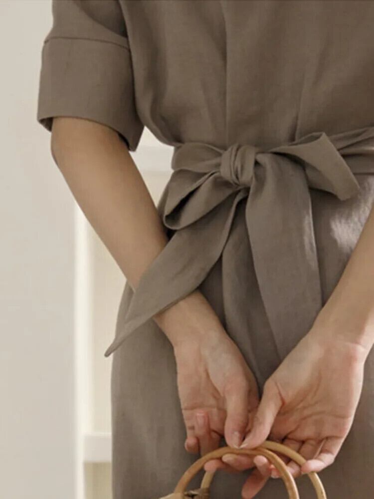 [EWQ] スタイル不規則ウエストタイドコットンリネンドレス五分袖ロングドレス 2024 春夏 8043 半袖 ハーフスリーブ スプリング 春物 サマー 夏物