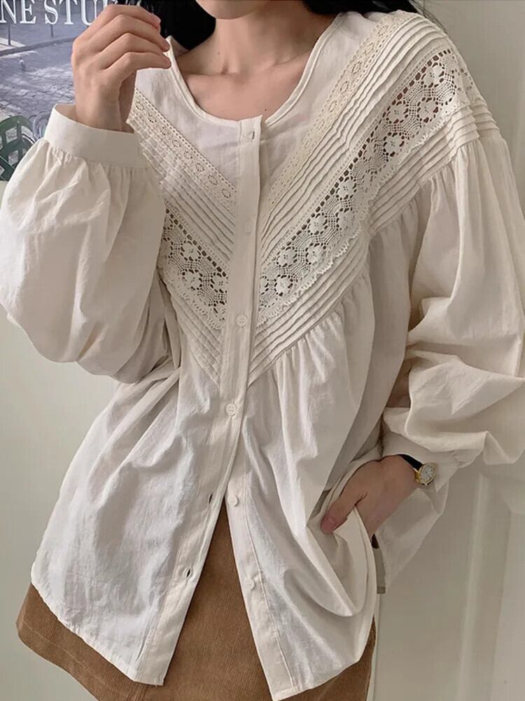 [EWQ] スタイルオールマッチ O ネックパッチワークアウトシャツ甘いレースバブルスリーブブラウスレディース 2024 春夏 16U7957 大人ガーリー スウィート キュート カジュアル スプリング 春物 サマー 夏物 Oネック