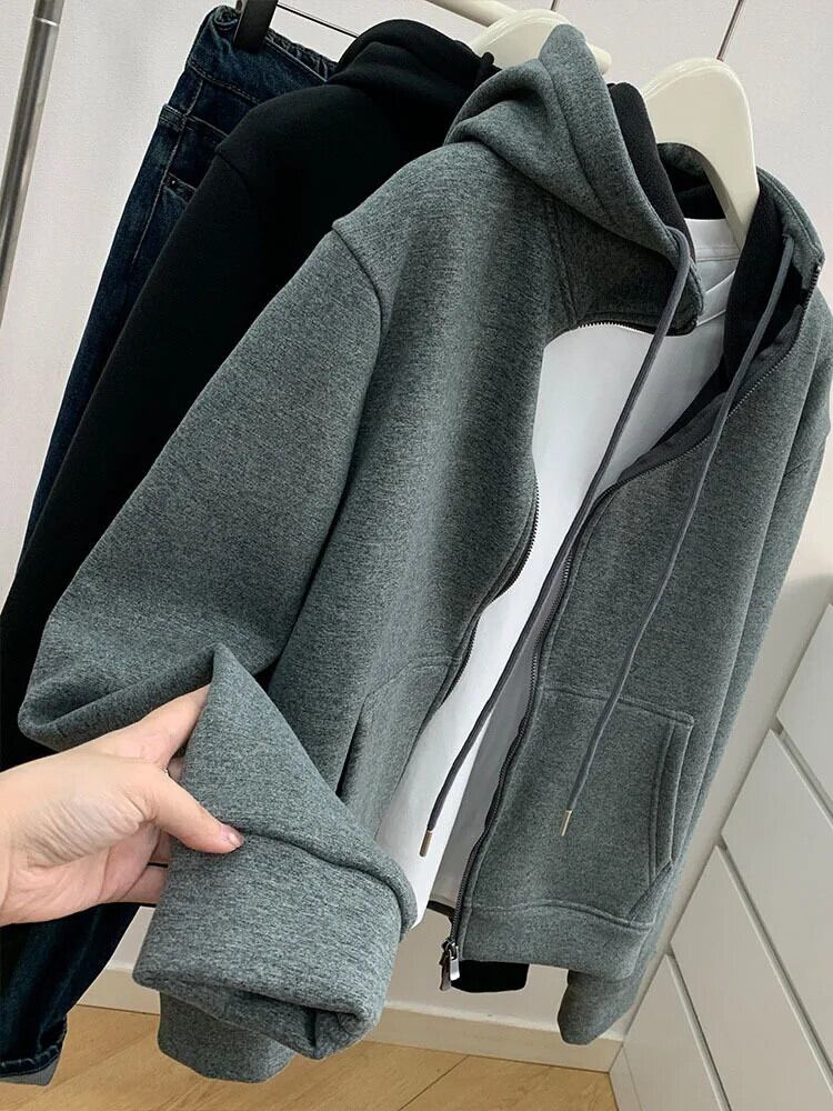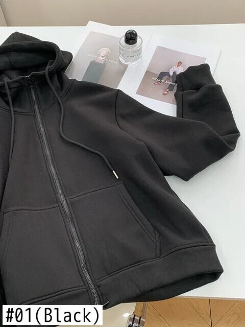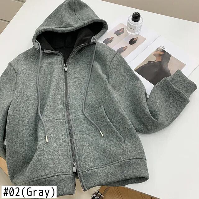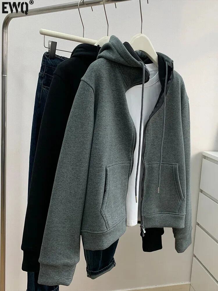 [EWQ] オールマッチブラックグレージッパーカーディガンフード付きスウェットシャツルーズぬいぐるみ厚手パーカー 2024 春秋 16U7360 スプリング 春物 オータム 秋物