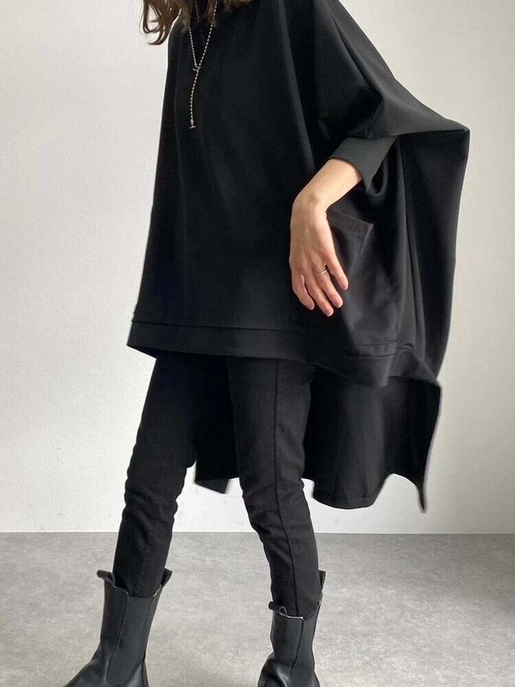 [EWQ] スタイル黒タートルネックイレギュラーヘムスウェットシャツビッグサイズプルオーバー長袖トップ 2024 春冬 16U7312 ロング ブラック スプリング 春物 ウィンター 冬物