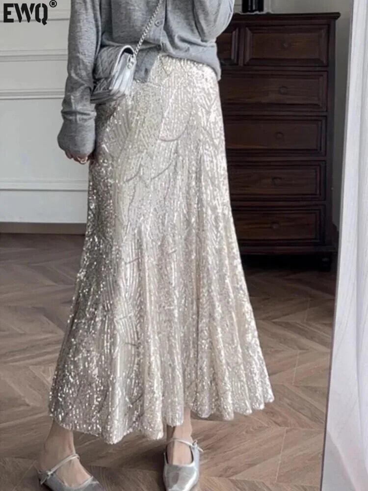 [EWQ] スパークリングシルバースパンコール A ライン見事フィッシュテール 5 分丈スカート 婦人 2024 春秋 16U7382 スプリング 春物 オータム 秋物 Aライン 銀