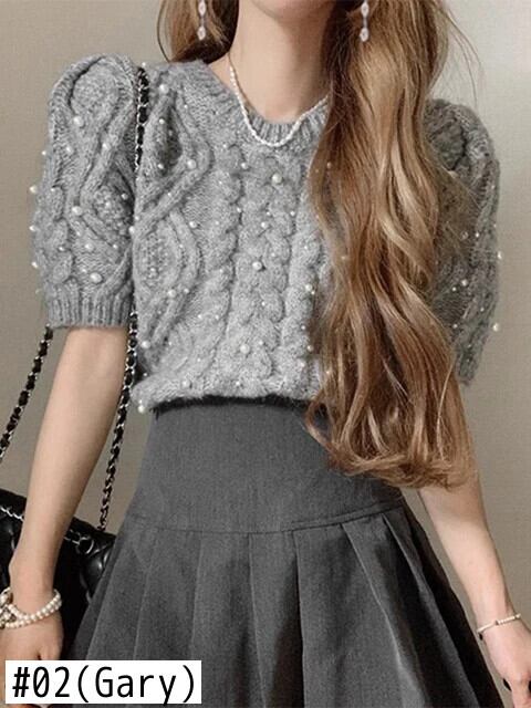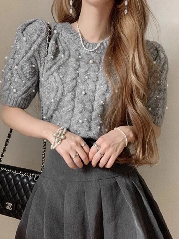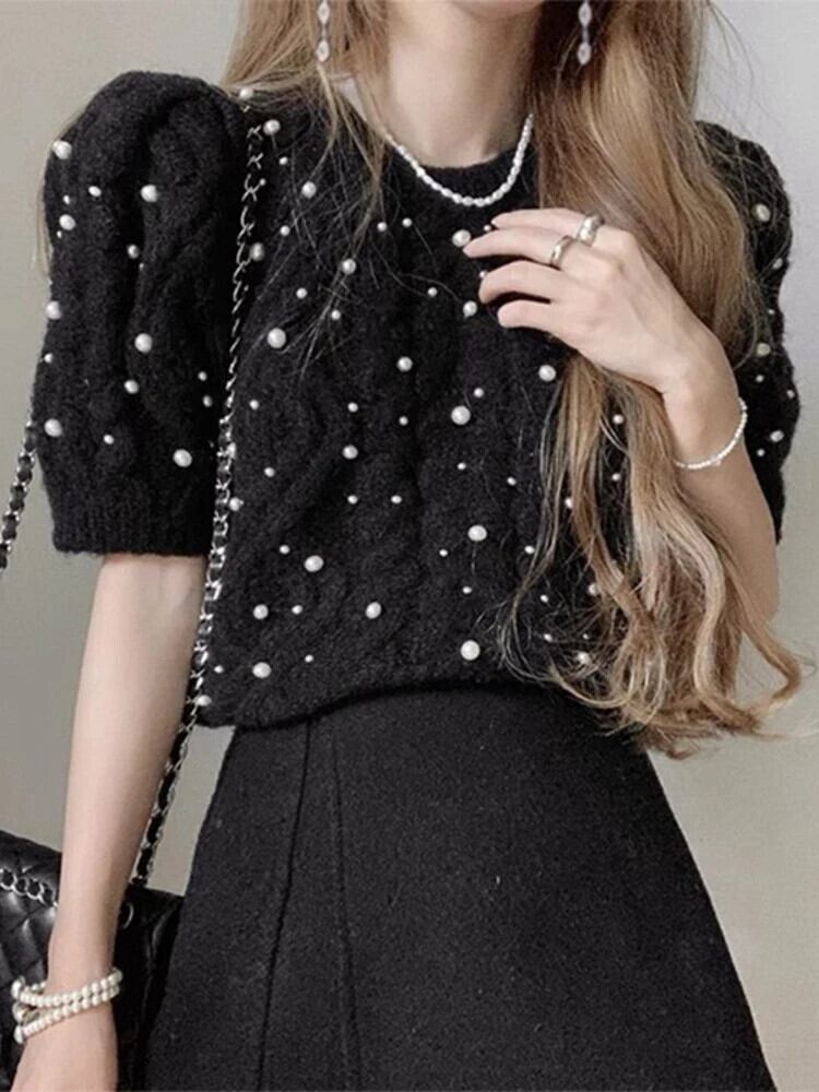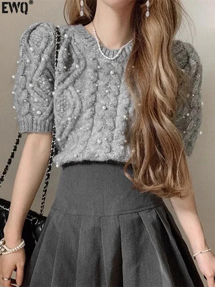 [EWQ] スタイルビーズプルオーバーニット織りヴィンテージファッションオールマッチバブル半袖トップ 2024 春夏 16U8038 ショート ハーフスリーブ スプリング 春物 サマー 夏物 ビンテージ