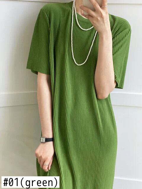 [EWQ] 美しいグリーンドレスプリーツルーズ因果 O ネックマキシドレス夏半袖 Vestidos ショート ハーフスリーブ サマー 夏物 Oネック