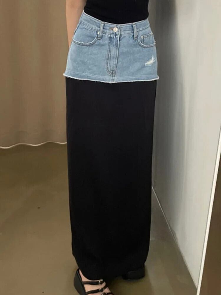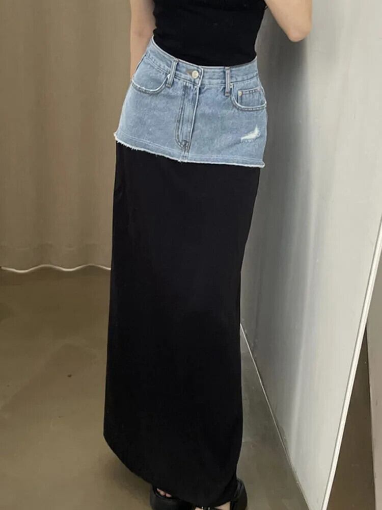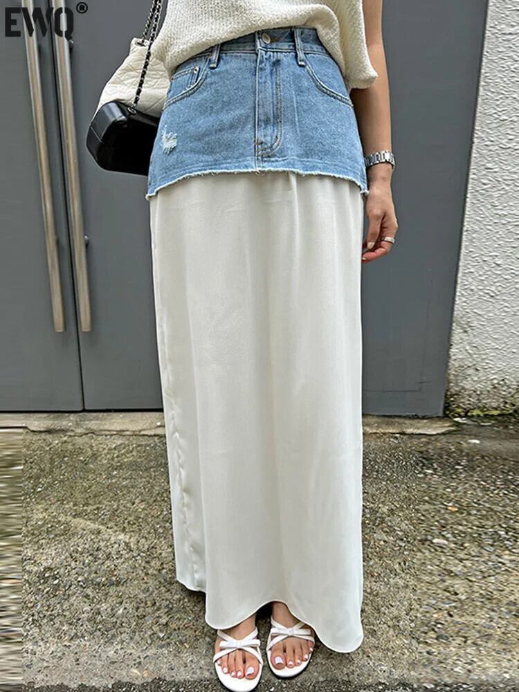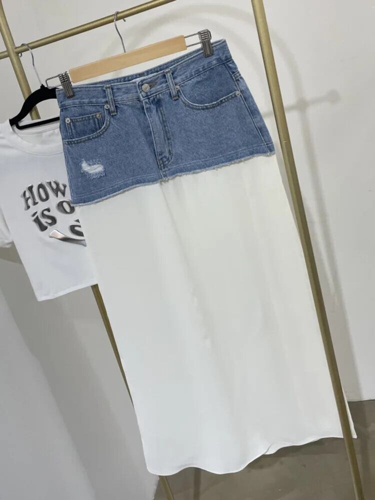 [EWQ] ウエストコントラストカラーデニムパッチワークスカート夏潮コーランシックスリムスカート 16O421 サマー 夏物