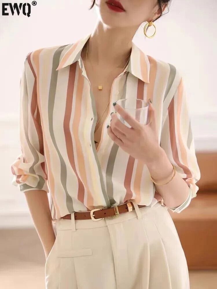 [EWQ] ストライプ シャツ トップス レディース 長袖 コントラストカラー シングルブレスト ブラウス 2024春夏 16U8293 ロング スプリング 春物 サマー 夏物