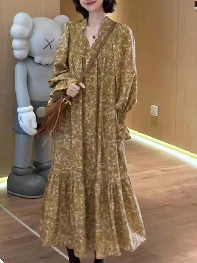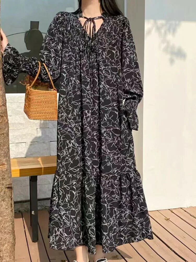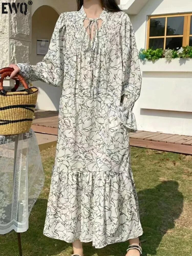 [EWQ] ルーズ特大長袖花柄ロングドレス V ネックレースアッププリント 2024 春夏 16U8272 スプリング 春物 サマー 夏物 Vネック