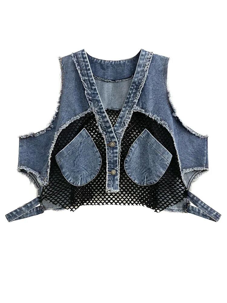 [EWQ] ストリート グリッドテルスプライス ショートデニムベスト ルーズパッチワーク ノースリーブジャケット トップス 2024春夏 16U8590 スプリング 春物 サマー 夏物