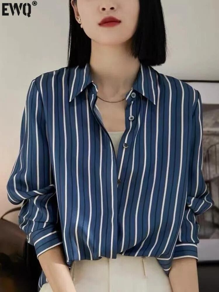 [EWQ] 気質オフィスレディ ブルーストライプ シャツ トップス レディース シングルブレスト ブラウス 2024春夏 16U8295 スプリング 春物 サマー 夏物 シルク 会社 学校 通勤や通学にも