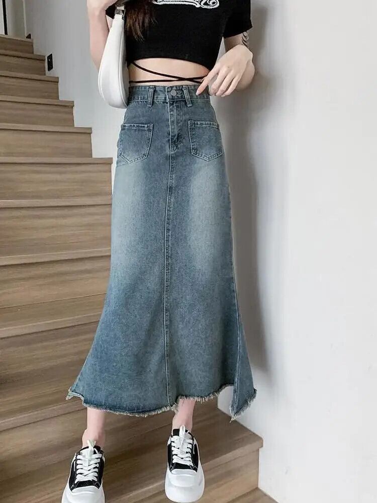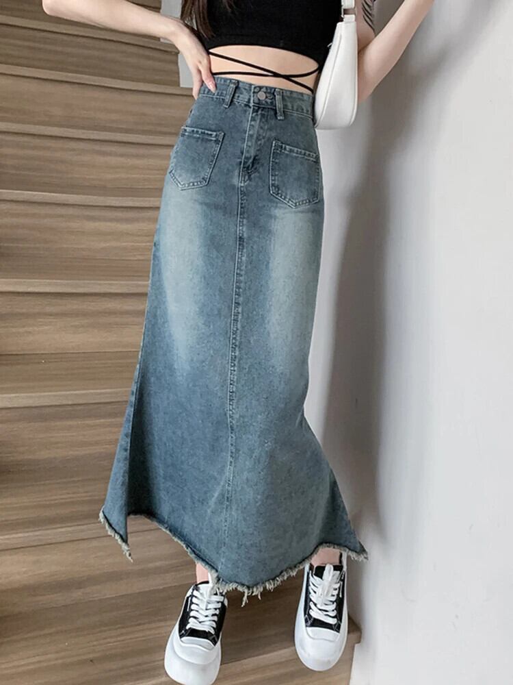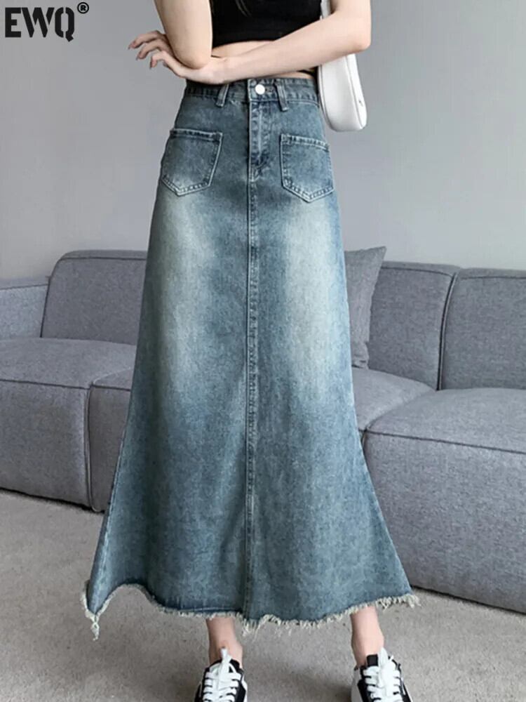 [EWQ] ミドル丈 Aライン スリム ポケット ラップ ヒップ フィッシュテール テル デニム スカート 婦人 2024 春夏 23A7739 スプリング 春物 サマー 夏物