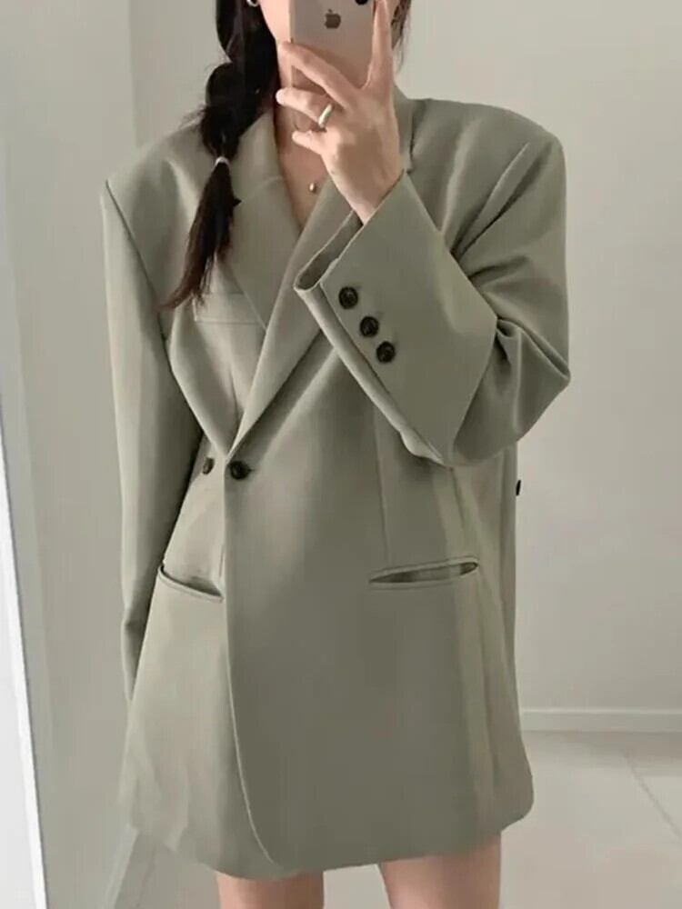 [EWQ] ブラック カーキ グリーン ラペル襟 1 つボタン 長袖 レディース ブレザー コート スーツ ジャケット 2024 春夏 16U6077 ロング スプリング 春物 ウィンター 冬物