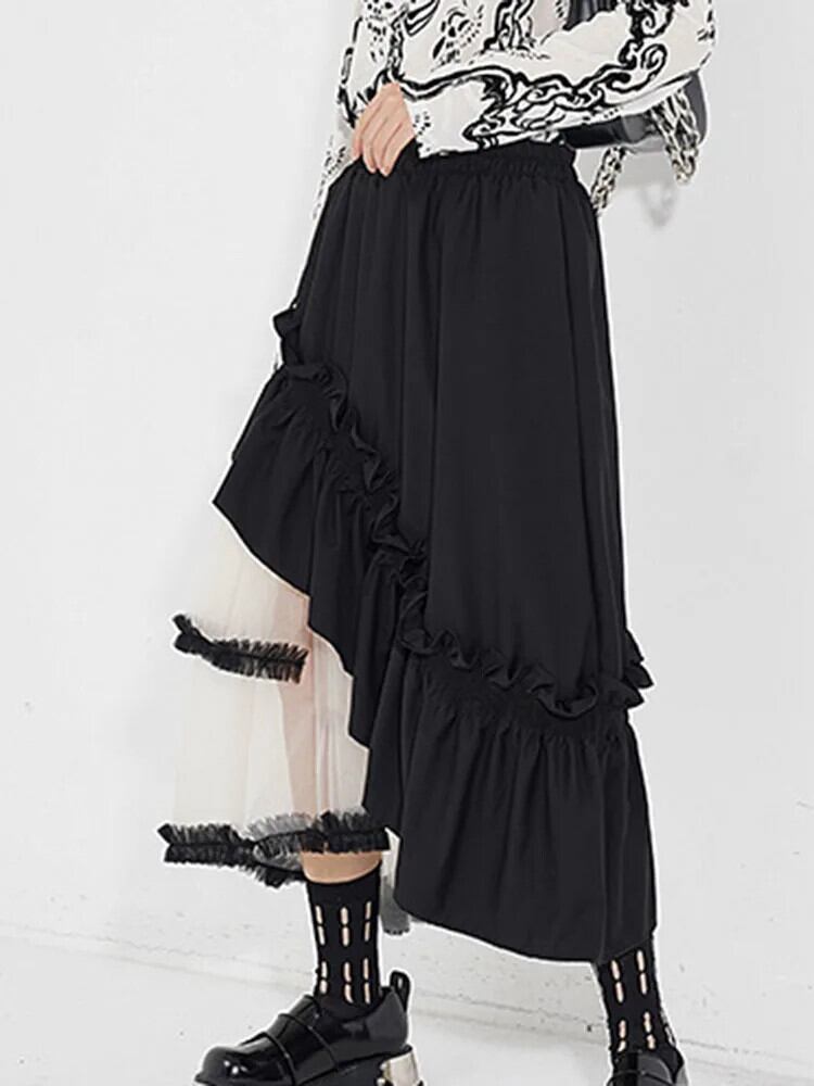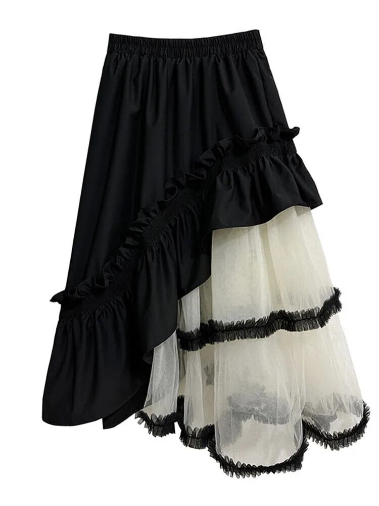 【EWQ】エイブル コントラストカラー 食用キクラゲ パッチワーク ミドル丈 メッシュスカート 2024春夏 16U8579 スプリング 春物 サマー 夏物